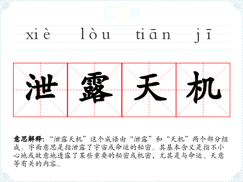 “泄露天机”这个成语由“泄露”和“天机”两个部分组成。字面意思是指泄露了宇宙或命运的秘密。其基本含义是指不小心地或故意地透露了某些重要的秘密或机密,尤其是与命运、天意等有关的内容。