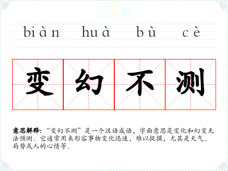 “变幻不测”是一个汉语成语,字面意思是变化和幻变无法预测。它通常用来形容事物变化迅速,难以捉摸,尤其是天气、局势或人的心情等。