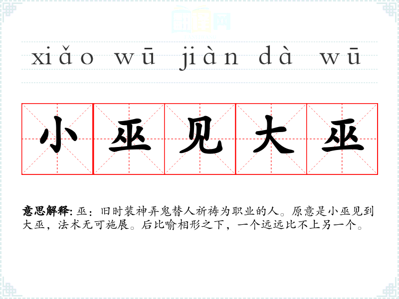 | 小巫见大巫 | 巫:旧时装神弄鬼替人祈祷为职业的人。原意是小巫见到大巫,法术无可施展。后比喻相形之下,一个远远比不上另一个。 |
