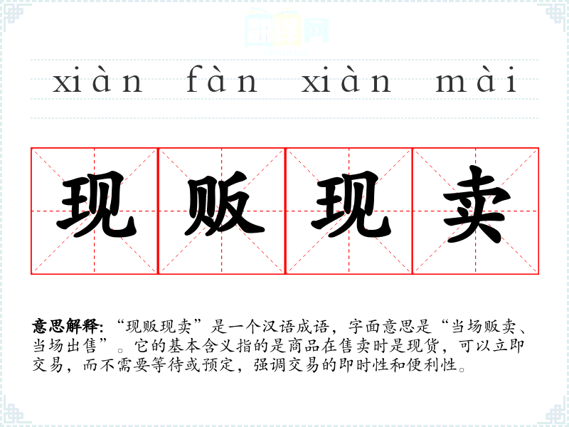 “现贩现卖”是一个汉语成语,字面意思是“当场贩卖、当场出售”。它的基本含义指的是商品在售卖时是现货,可以立即交易,而不需要等待或预定,强调交易的即时性和便利性。