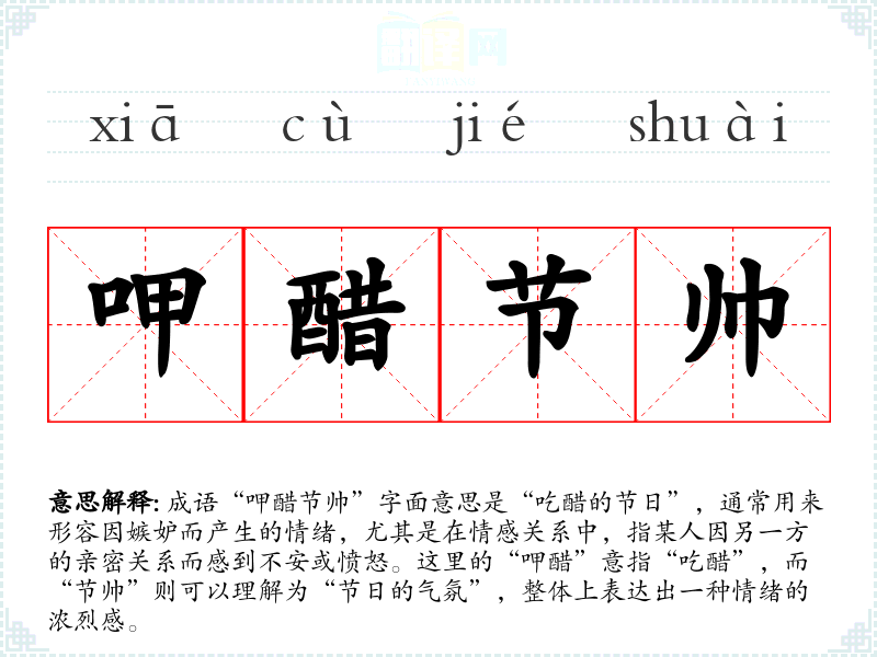 成语“呷醋节帅”字面意思是“吃醋的节日”,通常用来形容因嫉妒而产生的情绪,尤其是在情感关系中,指某人因另一方的亲密关系而感到不安或愤怒。这里的“呷醋”意指“吃醋”,而“节帅”则可以理解为“节日的气氛”,整体上表达出一种情绪的浓烈感。
