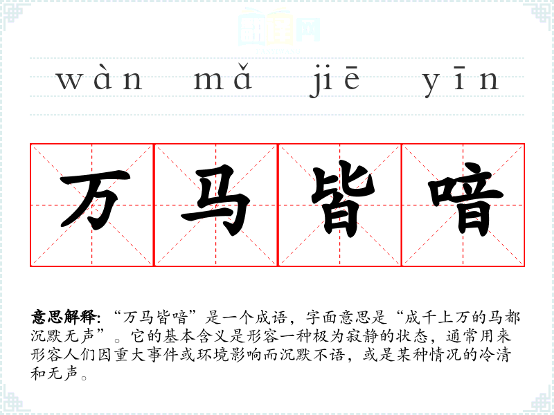 “万马皆喑”是一个成语,字面意思是“成千上万的马都沉默无声”。它的基本含义是形容一种极为寂静的状态,通常用来形容人们因重大**或环境影响而沉默不语,或是某种情况的冷清和无声。