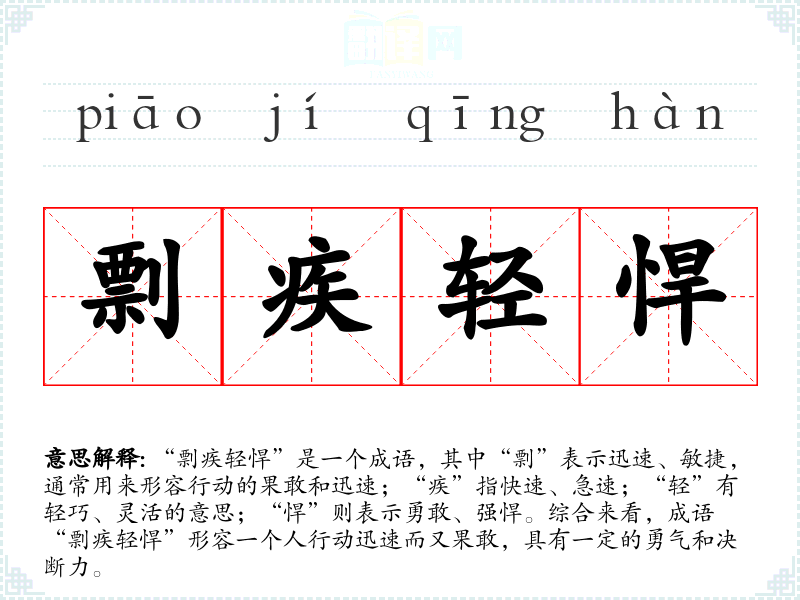 该成语的具体出处较少,可能源于古代文人的描写,强调了在面对困难或挑战时,快速果敢的行动方式。在**古代军事和政治的语境中,强调“剽疾轻悍”的人物常常是那些在关键时刻果断出击、迅速应变的将领或英雄。