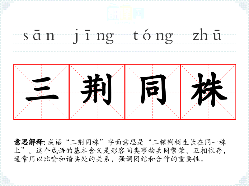 成语“三荆同株”字面意思是“三棵荆树生长在同一株上”。这个成语的基本含义是形容同类事物共同繁荣、互相依存,通常用以比喻和谐共处的关系,强调团结和合作的重要性。