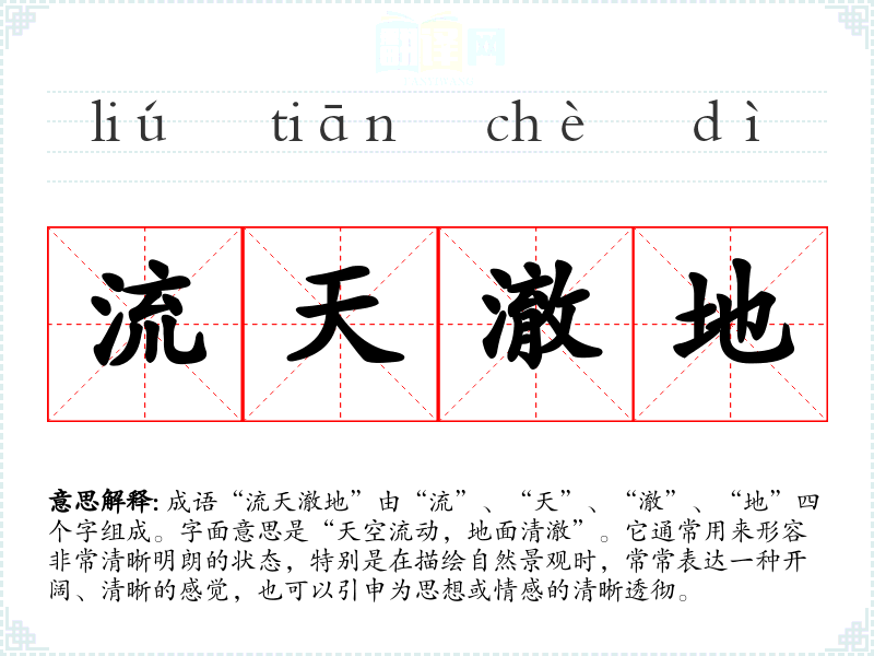 成语“流天澈地”由“流”、“天”、“澈”、“地”四个字组成。字面意思是“天空流动,地面清澈”。它通常用来形容非常清晰明朗的状态,特别是在描绘自然景观时,常常表达一种开阔、清晰的感觉,也可以引申为思想或情感的清晰透彻。