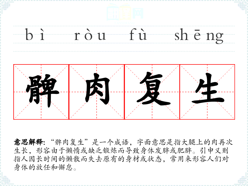 “髀肉复生”是一个成语,字面意思是指大腿上的肉再次生长,形容由于懒惰或缺乏锻炼而导致身体发胖或肥胖。引申义则指人因长时间的懒散而失去原有的身材或状态,常用来形容人们对身体的放任和懈怠。