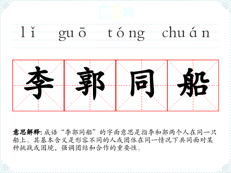 成语“李郭同船”的字面意思是指李和郭两个人在同一只船上。其基本含义是形容不同的人或团体在同一情况下共同面对某种挑战或困境,强调团结和合作的重要性。
