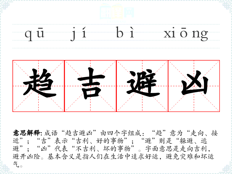 成语“趋吉避凶”由四个字组成:“趋”意为“走向、接近”;“吉”表示“吉利、好的事物”;“避”则是“躲避、逃避”;“凶”代表“不吉利、坏的事物”。字面意思是走向吉利,避开凶险。基本含义是指人们在生活中追求好运,避免灾难和坏运气。