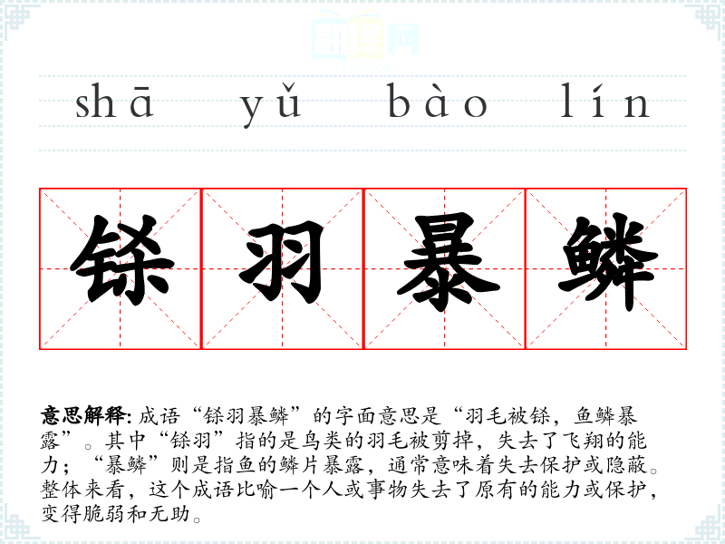 成语“铩羽暴鳞”的字面意思是“羽毛被铩,鱼鳞暴露”。其中“铩羽”指的是鸟类的羽毛被剪掉,失去了飞翔的能力;“暴鳞”则是指鱼的鳞片暴露,通常意味着失去保护或隐蔽。整体来看,这个成语比喻一个人或事物失去了原有的能力或保护,变得脆弱和无助。