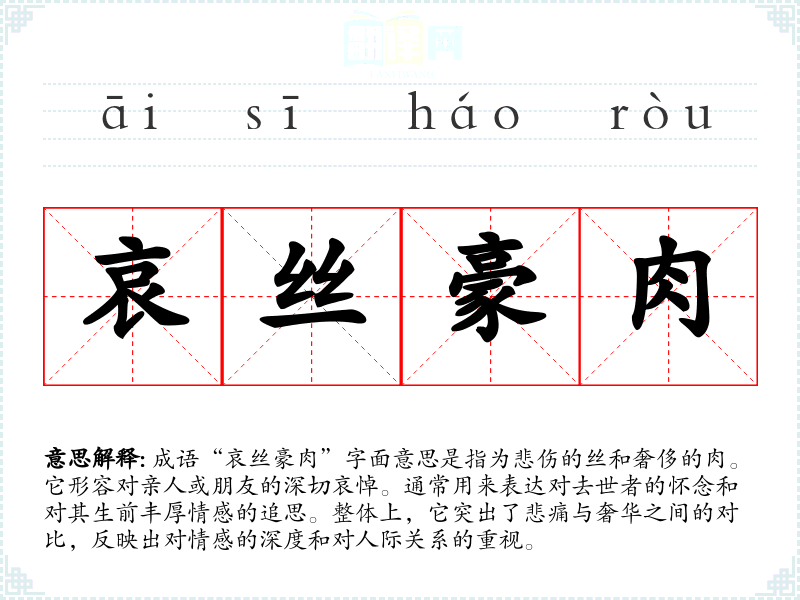 “哀丝豪肉”给人一种哀伤的感觉,联想到失去亲友时的痛苦和孤独。它提醒我们珍惜身边的人,同时反映出人际关系的复杂性和情感的深度。这种情感在表达时常常伴随着对生活的反思与感悟。