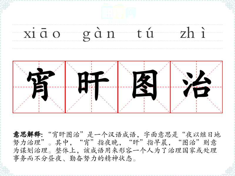 “宵旰图治”是一个汉语成语,字面意思是“夜以继日地努力治理”。其中,“宵”指夜晚,“旰”指早晨,“图治”则意为谋划治理。整体上,该成语用来形容一个人为了治理国家或处理事务而不分昼夜、勤奋努力的精神状态。