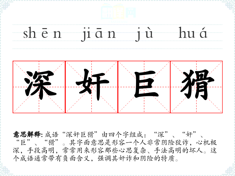 成语“深奸巨猾”由四个字组成:“深”、“奸”、“巨”、“猾”。其字面意思是形容一个人非常阴险狡诈,心机极深,手段高明,常常用来形容那些心思复杂、手法高明的坏人。这个成语通常带有负面含义,强调其奸诈和阴险的特质。
