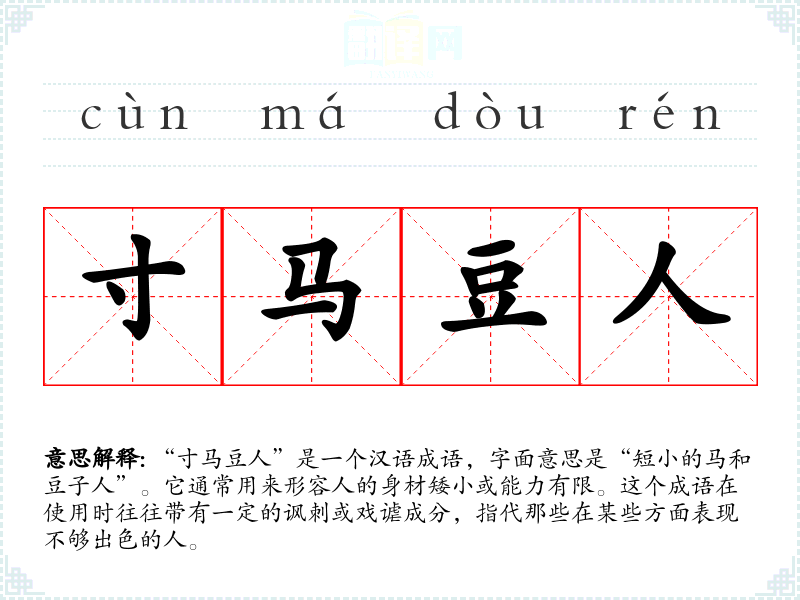“寸马豆人”是一个汉语成语,字面意思是“短小的马和豆子人”。它通常用来形容人的身材矮小或能力有限。这个成语在使用时往往带有一定的讽刺或戏谑成分,指代那些在某些方面表现不够出色的人。