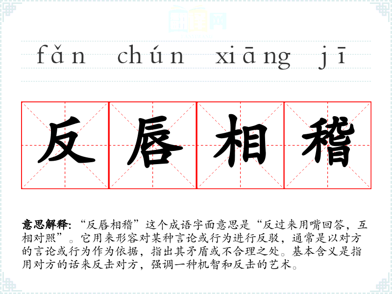 “反唇相稽”这个成语字面意思是“反过来用嘴回答,互相对照”。它用来形容对某种言论或行为进行反驳,通常是以对方的言论或行为作为依据,指出其矛盾或不合理之处。基本含义是指用对方的话来反击对方,强调一种机智和反击的艺术。