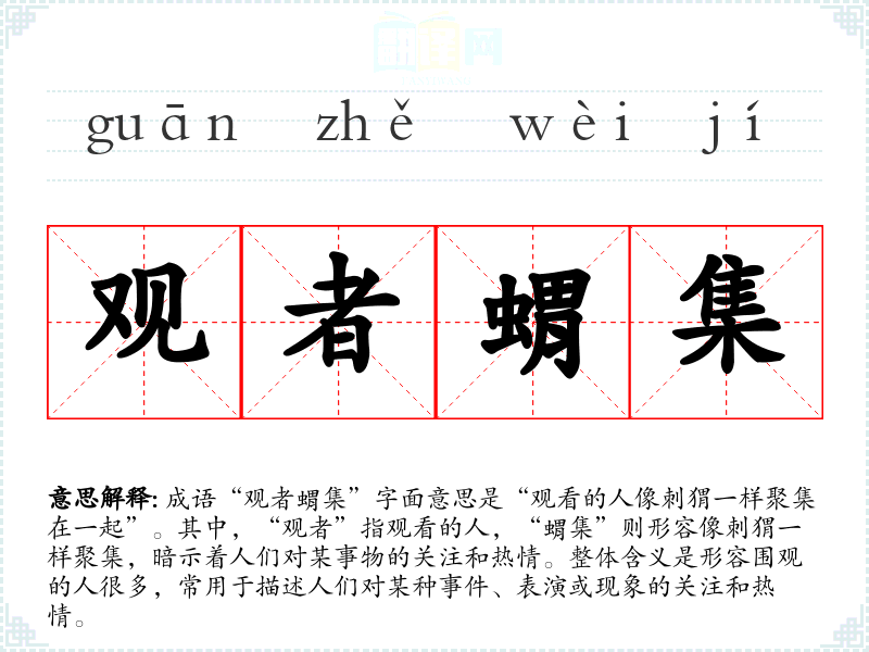 成语“观者蝟集”字面意思是“观看的人像刺猬一样聚集在一起”。其中,“观者”指观看的人,“蝟集”则形容像刺猬一样聚集,暗示着人们对某事物的关注和热情。整体含义是形容围观的人很多,常用于描述人们对某种**、表演或现象的关注和热情。