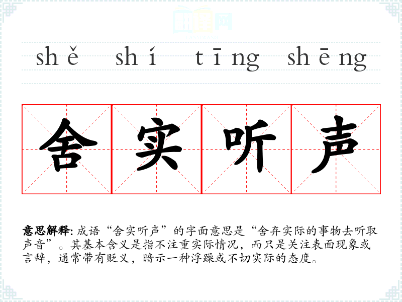 成语“舍实听声”的字面意思是“舍弃实际的事物去听取声音”。其基本含义是指不注重实际情况,而只是关注表面现象或言辞,通常带有贬义,暗示一种浮躁或不切实际的态度。