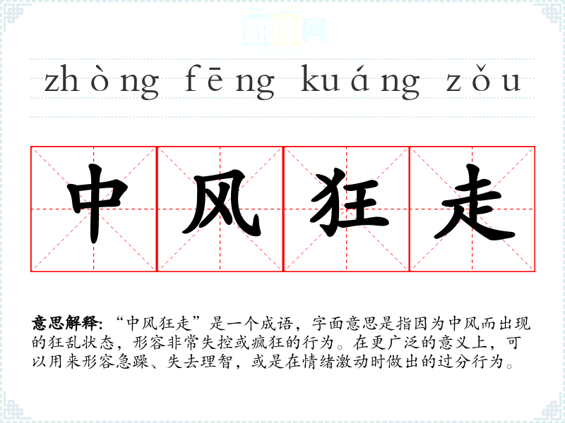 “中风狂走”是一个成语,字面意思是指因为中风而出现的狂乱状态,形容非常失控或疯狂的行为。在更广泛的意义上,可以用来形容急躁、失去理智,或是在情绪激动时做出的过分行为。