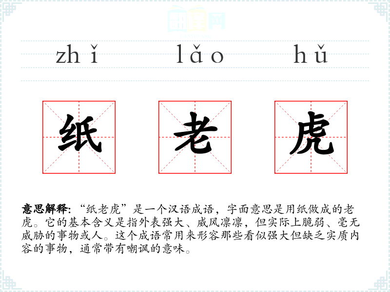 “纸”是一个汉语成语,字面意思是用纸做成的。它的基本含义是指外表强大、威风凛凛,但实际上脆弱、毫无威胁的事物或人。这个成语常用来形容那些看似强大但缺乏实质内容的事物,通常带有嘲讽的意味。