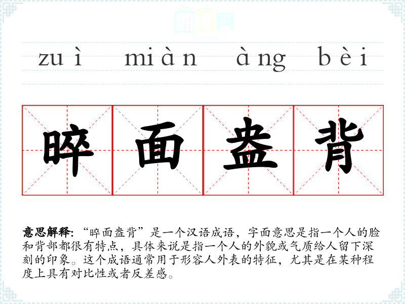 “晬面盎背”是一个汉语成语,字面意思是指一个人的脸和背部都很有特点,具体来说是指一个人的外貌或气质给人留下深刻的印象。这个成语通常用于形容人外表的特征,尤其是在某种程度上具有对比性或者反差感。