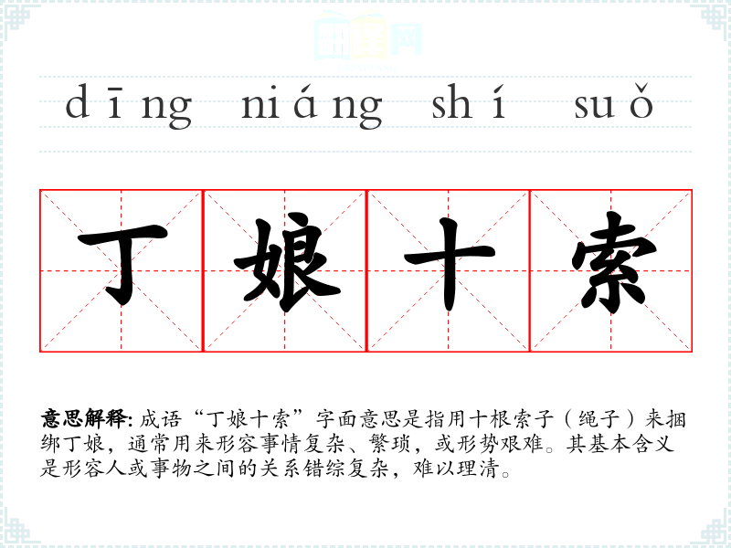 成语“丁娘十索”字面意思是指用十根索子(绳子)来捆绑丁娘,通常用来形容事情复杂、繁琐,或形势艰难。其基本含义是形容人或事物之间的关系错综复杂,难以理清。