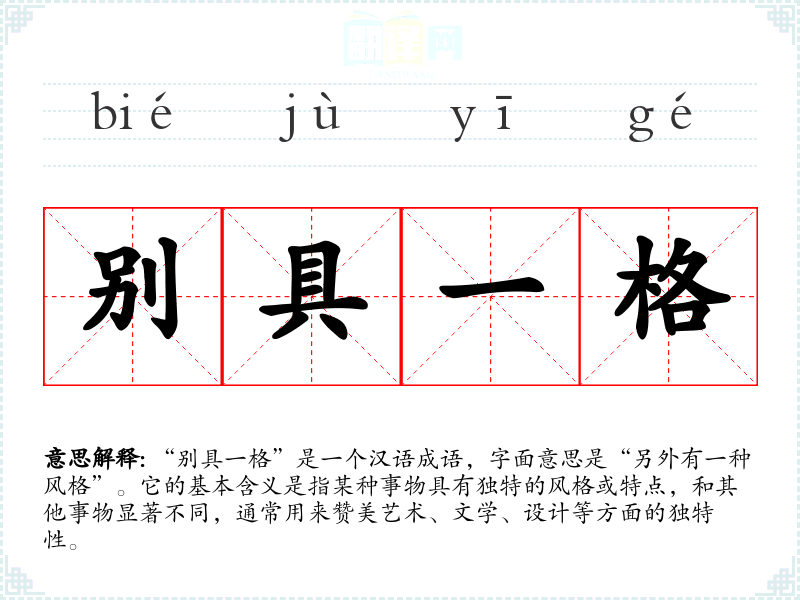 “别具一格”是一个汉语成语,字面意思是“另外有一种风格”。它的基本含义是指某种事物具有独特的风格或特点,和其他事物显著不同,通常用来赞美艺术、文学、设计等方面的独特性。