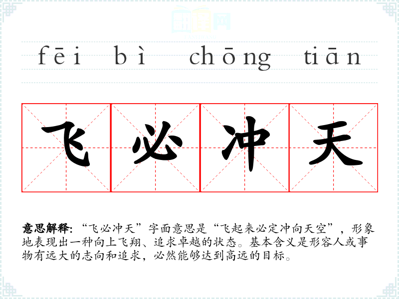 “飞必冲天”字面意思是“飞起来必定冲向天空”,形象地表现出一种向上飞翔、追求卓越的状态。基本含义是形容人或事物有远大的志向和追求,必然能够达到高远的目标。