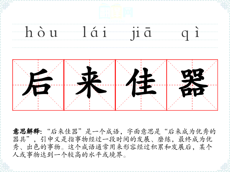 “后来佳器”是一个成语,字面意思是“后来成为优秀的器具”,引申义是指事物经过一段时间的发展、磨练,最终成为优秀、出色的事物。这个成语通常用来形容经过积累和发展后,某个人或事物达到一个较高的水平或境界。