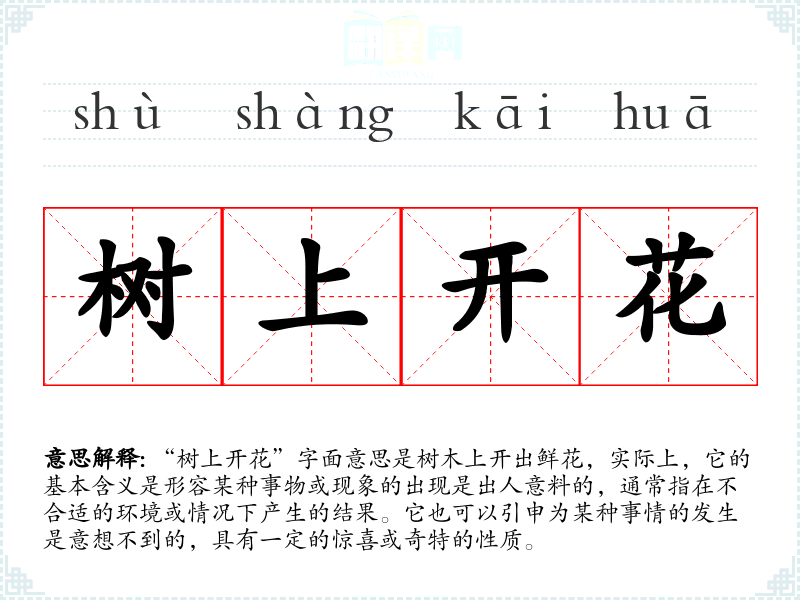“树上开花”字面意思是树木上开出鲜花,实际上,它的基本含义是形容某种事物或现象的出现是出人意料的,通常指在不合适的环境或情况下产生的结果。它也可以引申为某种事情的发生是意想不到的,具有一定的惊喜或奇特的性质。