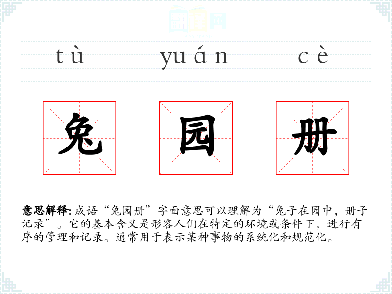成语“兔园册”字面意思可以理解为“兔子在园中,册子记录”。它的基本含义是形容人们在特定的环境或条件下,进行有序的管理和记录。通常用于表示某种事物的系统化和规范化。