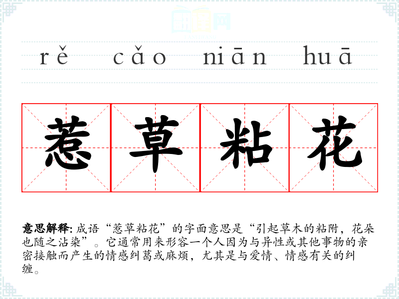 成语“惹草粘花”的字面意思是“引起草木的粘附,花朵也随之沾染”。它通常用来形容一个人因为与异性或其他事物的亲密接触而产生的情感纠葛或麻烦,尤其是与爱情、情感有关的纠缠。