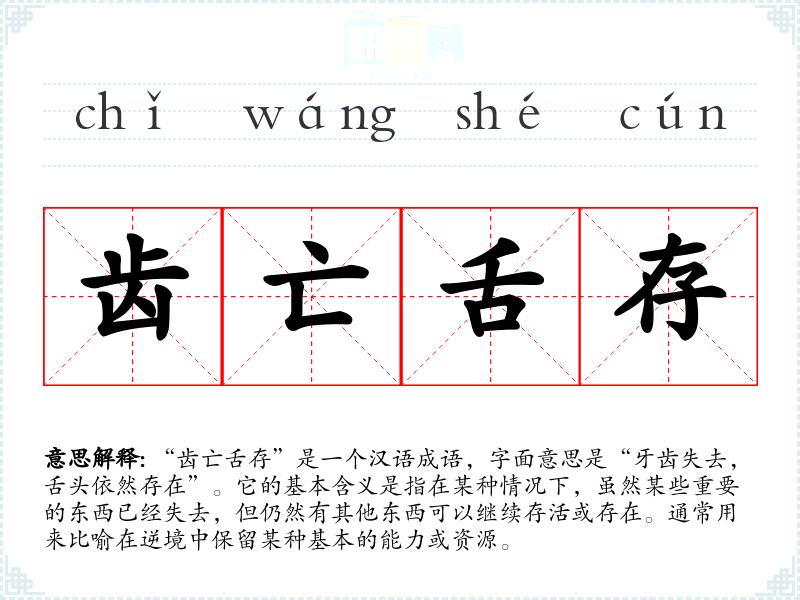 “齿亡舌存”是一个汉语成语,字面意思是“牙齿失去,舌头依然存在”。它的基本含义是指在某种情况下,虽然某些重要的东西已经失去,但仍然有其他东西可以继续存活或存在。通常用来比喻在逆境中保留某种基本的能力或资源。