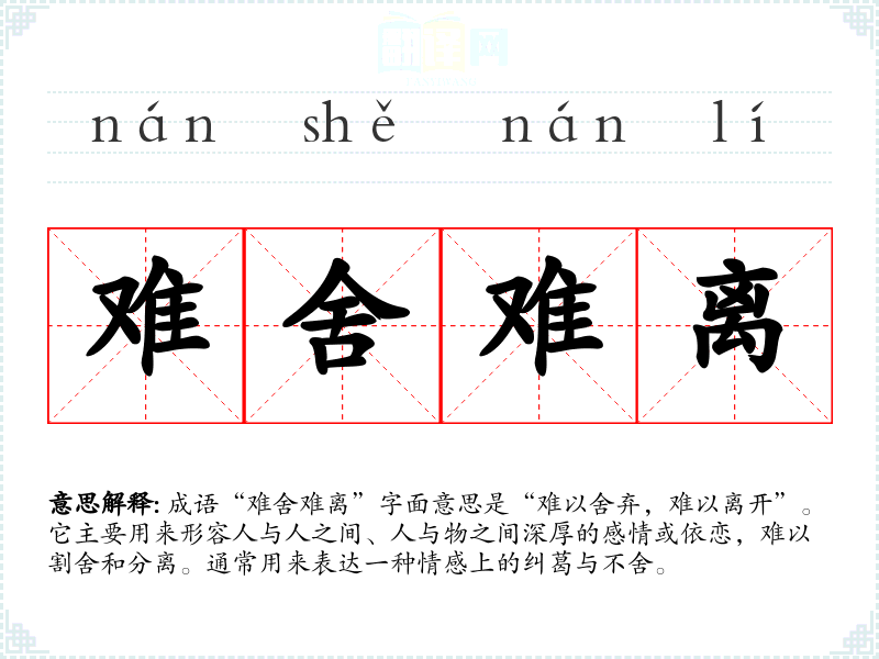 成语“难舍难离”字面意思是“难以舍弃,难以离开”。它主要用来形容人与人之间、人与物之间深厚的感情或依恋,难以割舍和分离。通常用来表达一种情感上的纠葛与不舍。