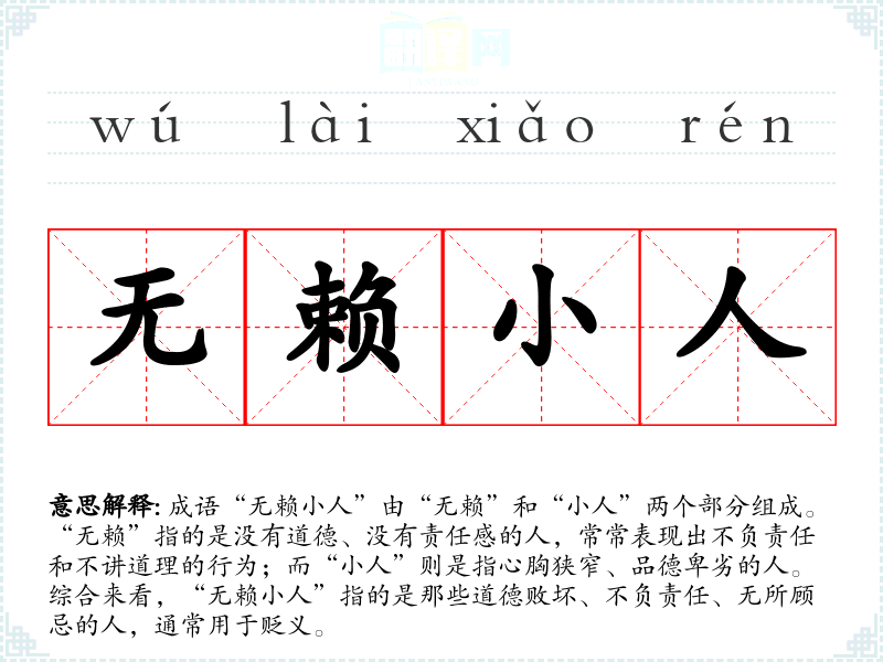 成语“无赖小人”由“无赖”和“小人”两个部分组成。“无赖”指的是没有道德、没有责任感的人,常常表现出不负责任和不讲道理的行为;而“小人”则是指心胸狭窄、品德卑劣的人。综合来看,“无赖小人”指的是那些道德败坏、不负责任、无所顾忌的人,通常用于贬义。