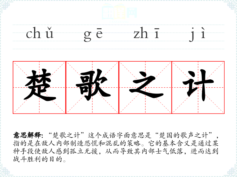 “楚歌之计”这个成语字面意思是“楚国的歌声之计”,指的是在敌人内部制造恐慌和混乱的策略。它的基本含义是通过某种手段使敌人感到孤立无援,从而导致其内部士气低落,进而达到战斗胜利的目的。
