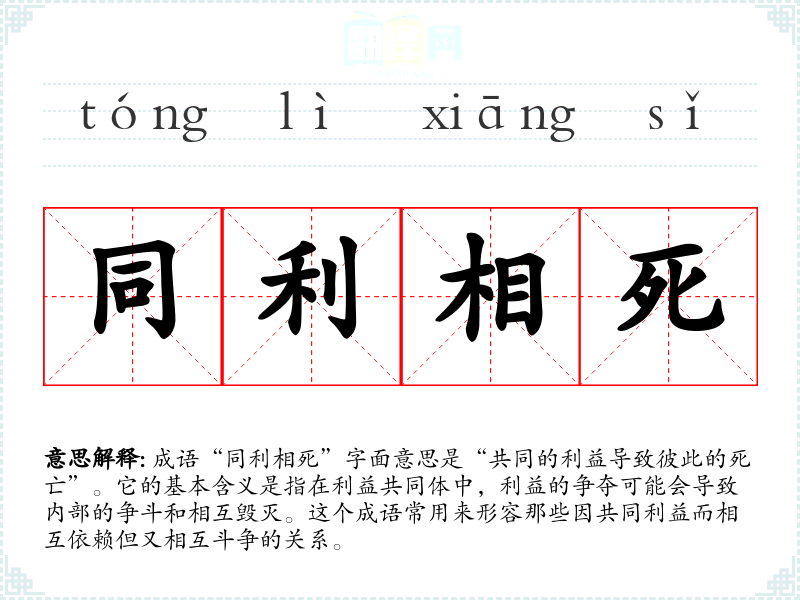 成语“同利相死”字面意思是“共同的利益导致彼此的死亡”。它的基本含义是指在利益共同体中,利益的争夺可能会导致内部的争斗和相互毁灭。这个成语常用来形容那些因共同利益而相互依赖但又相互斗争的关系。
