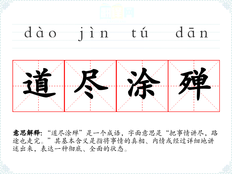 该成语的来源较为模糊,可能与古代文学作品中叙述详细、深入的表达方式相关。成语中“道尽”表示说尽、讲完,而“涂殚”则引申为道路走完,结合在一起,体现出一种完整的叙述过程。