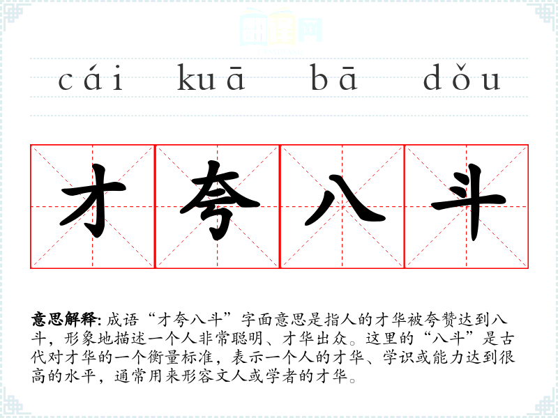 成语“才夸八斗”字面意思是指人的才华被夸赞达到八斗,形象地描述一个人非常聪明、才华出众。这里的“八斗”是古代对才华的一个衡量标准,表示一个人的才华、学识或能力达到很高的水平,通常用来形容文人或学者的才华。