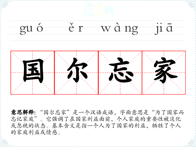 - 不顾家庭:形容对家庭的忽视,与“国尔忘家”相对。