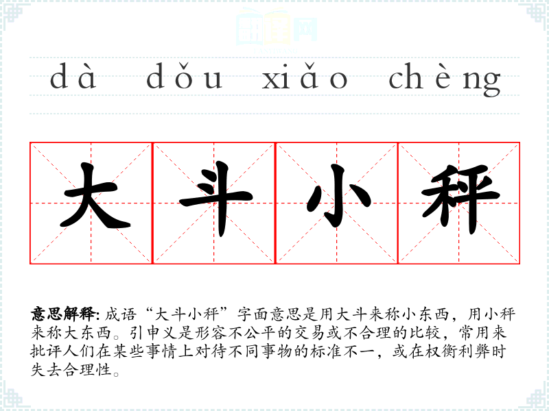 成语“大斗小秤”字面意思是用大斗来称小东西,用小秤来称大东西。引申义是形容不公平的交易或不合理的比较,常用来批评人们在某些事情上对待不同事物的标准不一,或在权衡利弊时失去合理性。