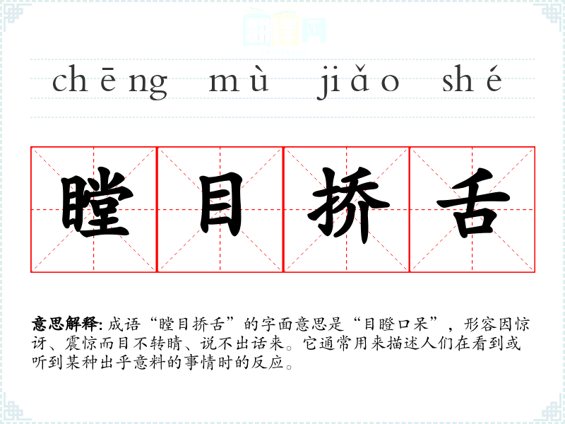 成语“瞠目挢舌”的字面意思是“目瞪口呆”,形容因惊讶、震惊而目不转睛、说不出话来。它通常用来描述人们在看到或听到某种出乎意料的事情时的反应。