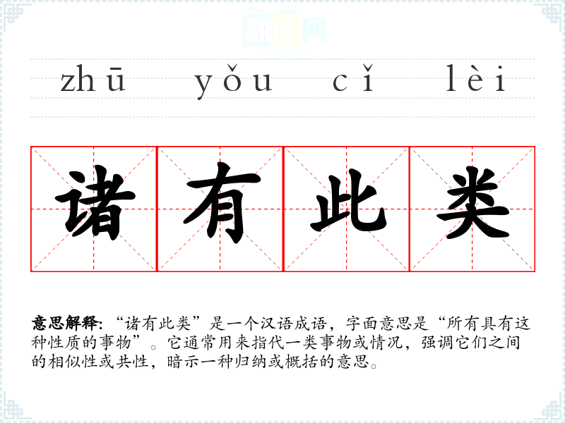 “诸有此类”是一个汉语成语,字面意思是“所有具有这种性质的事物”。它通常用来指代一类事物或情况,强调它们之间的相似性或共性,暗示一种归纳或概括的意思。