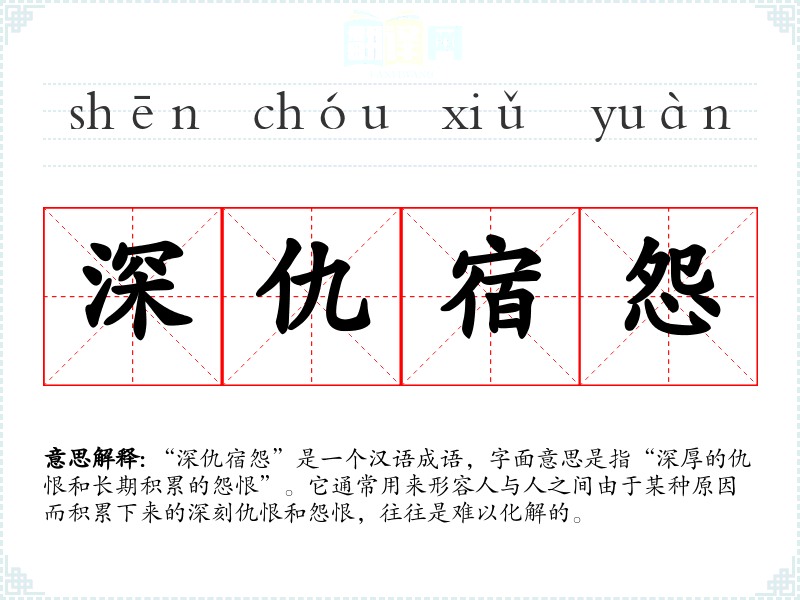 “深仇宿怨”是一个汉语成语,字面意思是指“深厚的仇恨和长期积累的怨恨”。它通常用来形容人与人之间由于某种原因而积累下来的深刻仇恨和怨恨,往往是难以化解的。