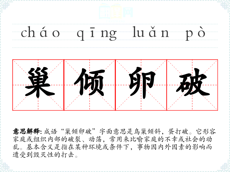 成语“巢倾卵破”字面意思是鸟巢倾斜,蛋打破。它形容家庭或组织内部的破裂、动荡,常用来比喻家庭的不幸或社会的动乱。基本含义是指在某种环境或条件下,事物因内外因素的影响而遭受到毁灭性的打击。