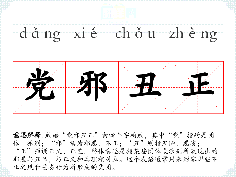 成语“党邪丑正”由四个字构成,其中“党”指的是团体、派别;“邪”意为邪恶、不正;“丑”则指丑陋、恶劣;“正”强调正义、正直。整体意思是指某些团体或派别所表现出的邪恶与丑陋,与正义和真理相对立。这个成语通常用来形容那些不正之风和恶劣行为所形成的集团。