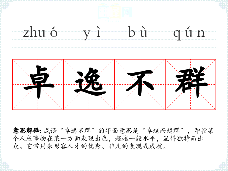 成语“卓逸不群”的字面意思是“卓越而超群”,即指某个人或事物在某一方面表现出色,超越一般水平,显得独特而出众。它常用来形容人才的优秀、非凡的表现或成就。