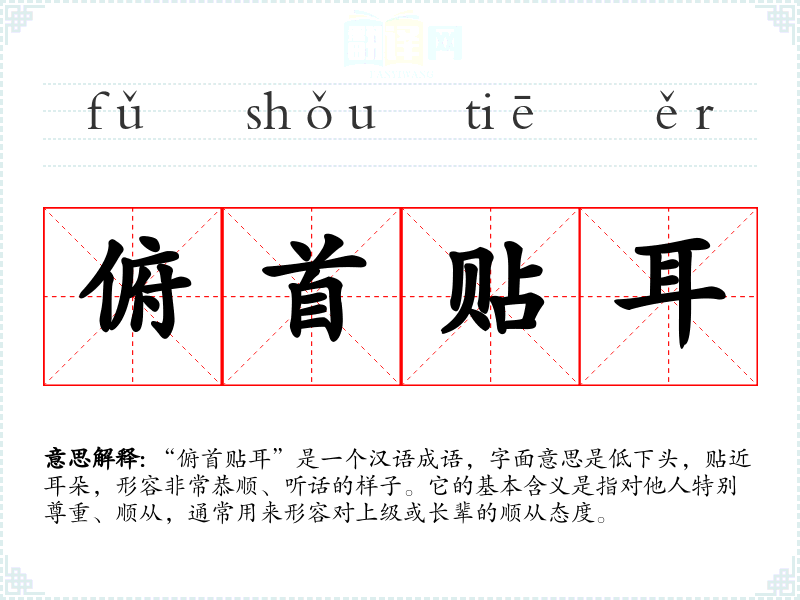 “俯首贴耳”是一个汉语成语,字面意思是低下头,贴近耳朵,形容非常恭顺、听话的样子。它的基本含义是指对他人特别尊重、顺从,通常用来形容对上级或长辈的顺从态度。