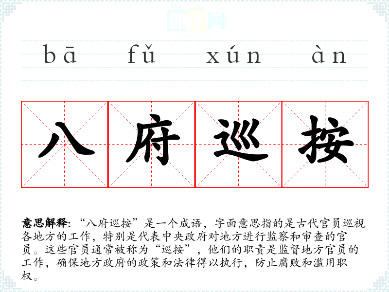 “八府巡按”是一个成语,字面意思指的是古代官员巡视各地方的工作,特别是代表中央政府对地方进行监察和审查的官员。这些官员通常被称为“巡按”,他们的职责是监督地方官员的工作,确保地方政府的政策和法律得以执行,防止腐败和滥用职权。