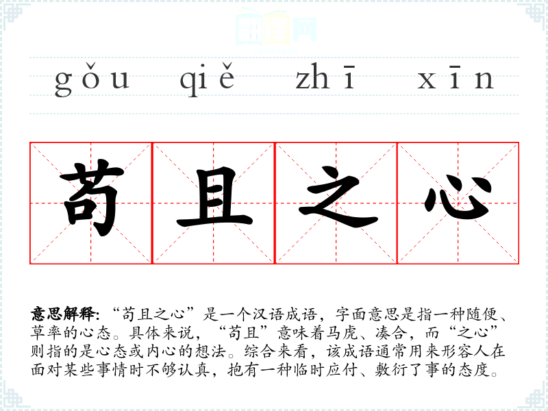 “苟且之心”是一个汉语成语,字面意思是指一种随便、草率的心态。具体来说,“苟且”意味着马虎、凑合,而“之心”则指的是心态或内心的想法。综合来看,该成语通常用来形容人在面对某些事情时不够认真,抱有一种临时应付、敷衍了事的态度。