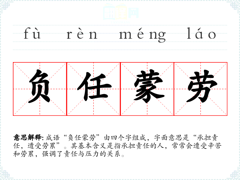 成语“负任蒙劳”由四个字组成,字面意思是“承担责任,遭受劳累”。其基本含义是指承担责任的人,常常会遭受辛苦和劳累,强调了责任与压力的关系。