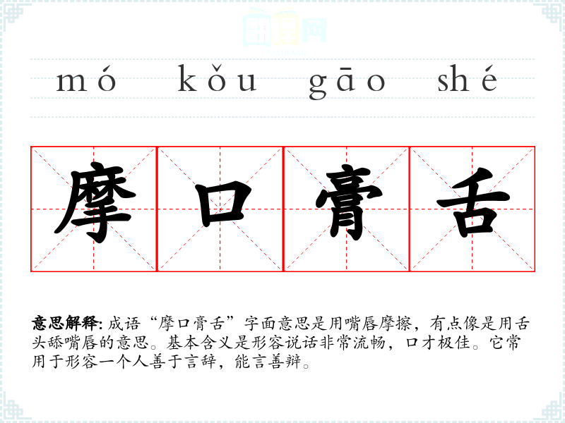 成语“摩口膏舌”字面意思是用嘴唇摩擦,有点像是用舌头舔嘴唇的意思。基本含义是形容说话非常流畅,口才极佳。它常用于形容一个人善于言辞,能言善辩。